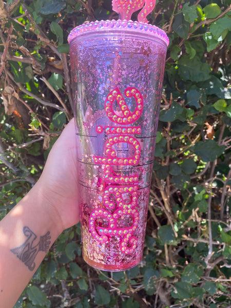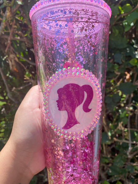 Pink Barbie snow globe comes with rhinestones lid and pink straw. Straw topper sold separately